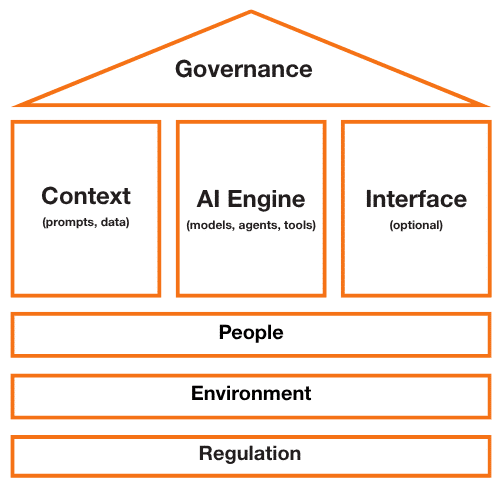 Agentic AI governance can be visualized as a layered architecture, where governance serves as the overarching structure ensuring alignment, safety, and accountability across all system components. Each layer, from the context that informs the system, to the AI engine that acts, and the interface that mediates human interaction, is influenced by and dependent on the people, environment, and regulatory frameworks surrounding it.