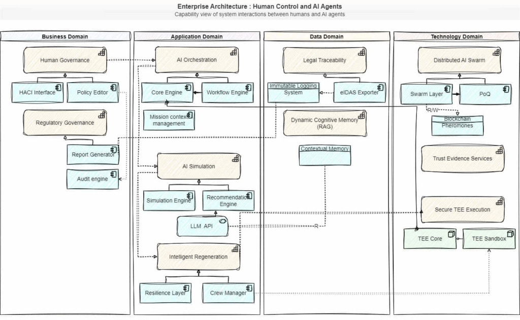 Orchestration components, simulation and RAG modules, agent management through the Crew Agent Manager, secure execution with sandboxes and Trusted Execution Environments, an immutable eIDAS-compliant ledger, and coordination mechanisms such as pheromones and Proof of Quality.