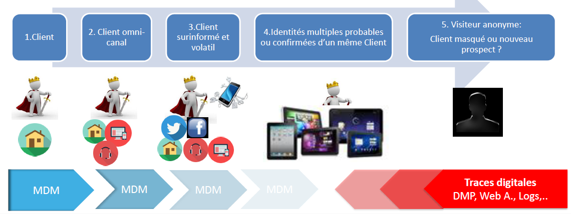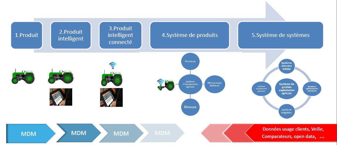Petit à petit, on voit apparaître des produits « intelligents ». L’information est « connectée » car elle arrive en temps réel et alimente des indicateurs dynamiques. Les familles de produits travaillent ensemble : par exemple, un médicament qui fonctionne avec un device… De même, le client est devenu multicanal. Il peut arriver à l’entreprise de manière claire ou bien caché, derrière des pseudos, un compte social, un device… Ces logiques de client et produit évoluent et les référentiels de l’entreprise doivent suivre pour capter toute la richesse de ces informations.